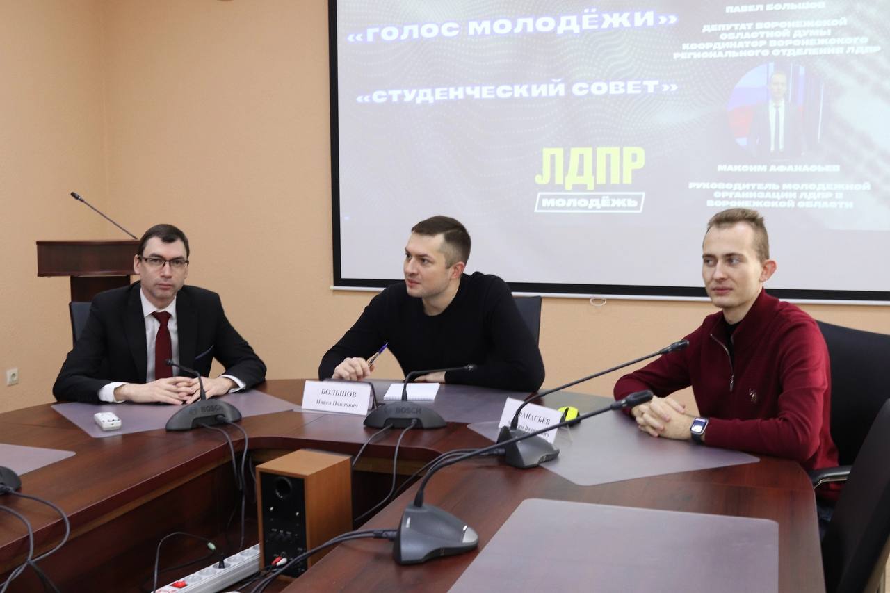 Руководитель фракции ЛДПР в Воронежской областной Думе Павел Большов провел встречу со студентами в формате открытого диалога, где каждый участник смог задать свои вопросы депутату и руководителю молодежного крыла ЛДПР в области Максиму Афанасьеву