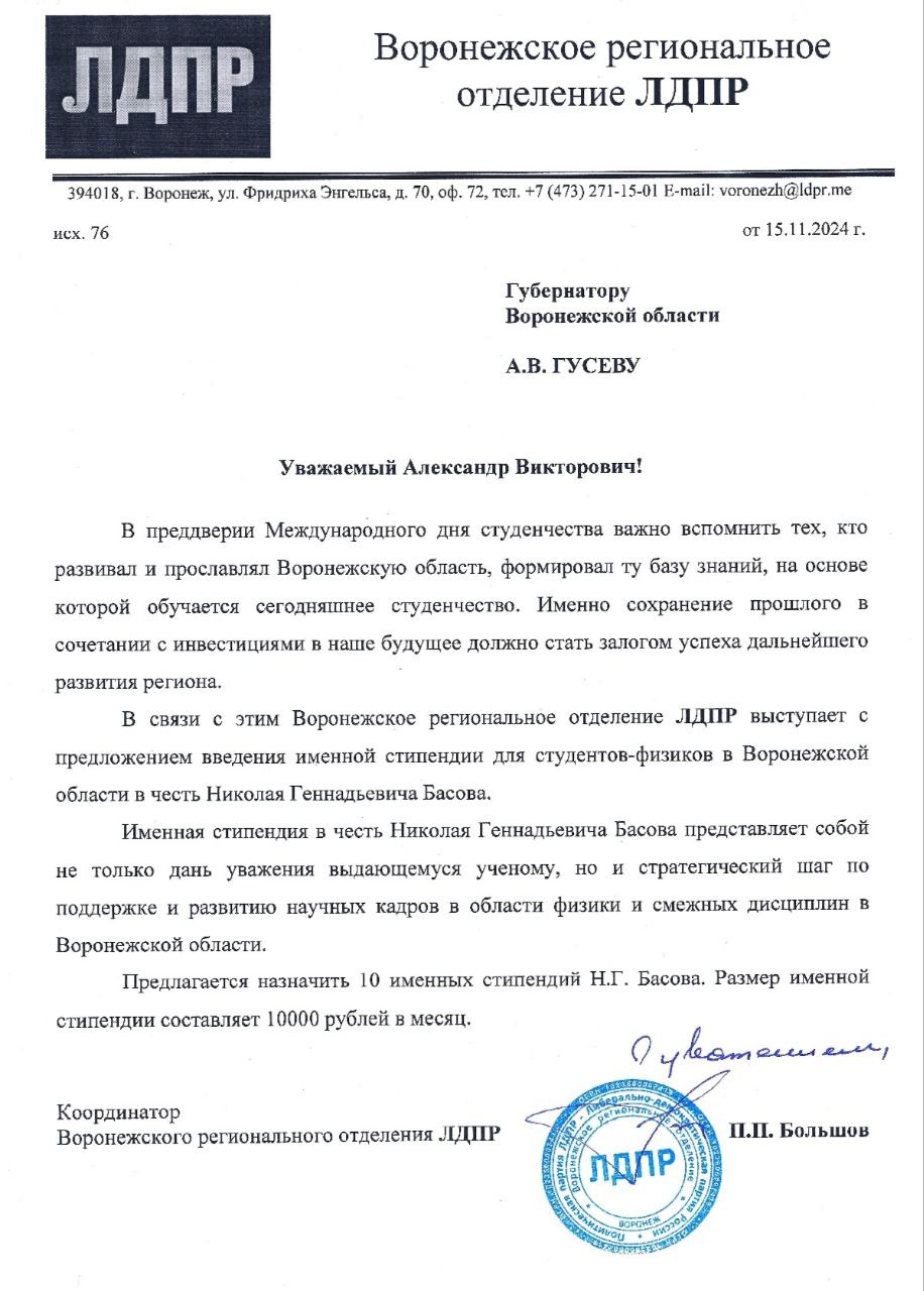 Координатор Воронежского РО ЛДПР Павел Большов предложил важную инициативу — учредить именную премию Николая Басова в размере 10 000 рублей. Это станет не только признанием заслуг ученого, но и стимулом для студентов и молодых ученых Воронежской области, которые стремятся идти по пути научных открытий и инноваций