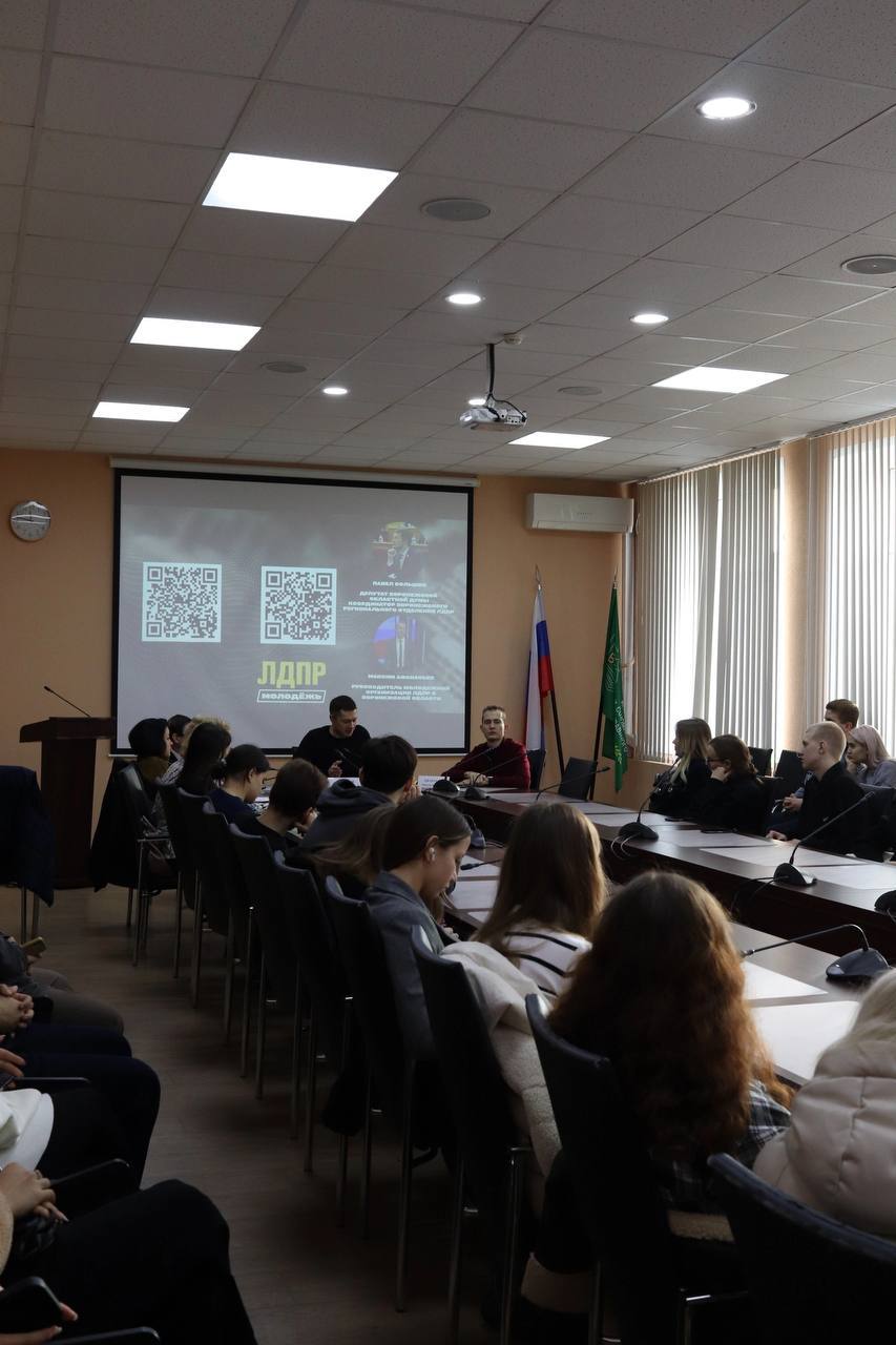 Руководитель фракции ЛДПР в Воронежской областной Думе Павел Большов провел встречу со студентами в формате открытого диалога, где каждый участник смог задать свои вопросы депутату и руководителю молодежного крыла ЛДПР в области Максиму Афанасьеву